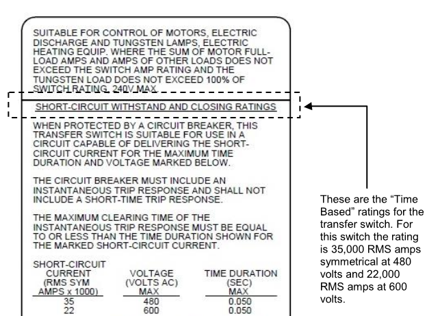 It seems different manufactures have different interpretations. So does this disqualify any breaker with an adjustable STPU / STD setting from protecting a 3-cycle [0.05sec] any breaker rated switch, even if the breaker has an instantaneous override less than the interrupting kA of the switch? It seems counterproductive because if I have a LSI MCCB I can almost always provide better protection in the instantaneous and in the short time than with a standard thermal mag. C/B. For low level arcing / fault currents, that sometimes extend into the LTD portion of the T/M I can adjust the STD down to pick up these currents faster providing better equipment and personal protection? One manufacture I talked to indicated that if the breaker has an adjustable short time ahead of the switch the switch is misapplied, even though the TCC’s show different? Then what about the specific breaker ratings, many breakers on the “Specific Breaker” list can be provided with a myriad of trip units types and styles from your standard TM, to LI, LSI, LSIG. So does this restrict the specific breaker to the T/M? The literature does not differentiate. Just curious if anyone else has run into this and other thought and opinions..