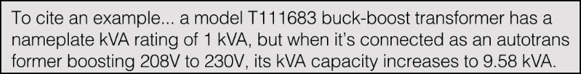I'm asking because Buck-Boost Transformers operate as an autotransformer, and can supply a load much larger than its nameplate suggests. See example from ACME (Hubbell) website http://www.delzer.com/hubbell/acme_cat/#122/z on page 122. Buck-Boosts can be up to 10KVA+ in size, and could potentially supply a load of 200KVA, depending on voltage. Attachment: