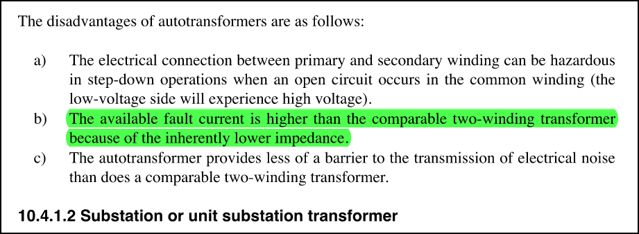 stevenal wrote: I'm not following your math here... 100KVA three phase 240V load. 100KVA / 240V / 1.732 *1000 = 240.56A, single phase would be even higher, 417A. stevenal wrote: VA is conserved so VA in is equal to VA out plus loss. True, VA is conserved, but it will not match the VA listed on the nameplate. See the attached picture in first comment or follow the link. It is not unusual for a BB Xfmr to supply a load 10x the nameplate rating, depending on the turns ratio. http://www.delzer.com/hubbell/acme_cat/#122/zstevenal wrote: I'm not sure how an auto is any more likely to saturate than any other. Agreed. But the fault at the secondary is not completely limited by xfmr impedance like it is in an iso-xfmr, because the secondary is wired directly to the primary. So modeling with an iso-xfmr would be incorrect. SKM Power Tools has a TYPE option in the Component Editor where you can select "Auto-TX Shell" or "Auto-TX Core" but it doesn't seem to do anything. I don't see another way of adding an Auto-Xfmr. Can ETAP or Easy Power do this?