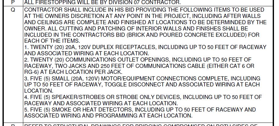 When I tell the consultants to put a general note on the drawings requiring the contractor to include a certain number extra devices to be located later on a new building or major renovation (receps, exit signs, smokes, horn/strobes, comm outlets, small equipment connections etc.) during construction they scoff at the idea. I say I can buy those recepts with the bid for $200 per now or $1200 via change order later with a whole lot more paperwork. Same with temperature control points. We always have to add some recepts, or a smoke detector, or a comm outlet here or there that was missed during design.