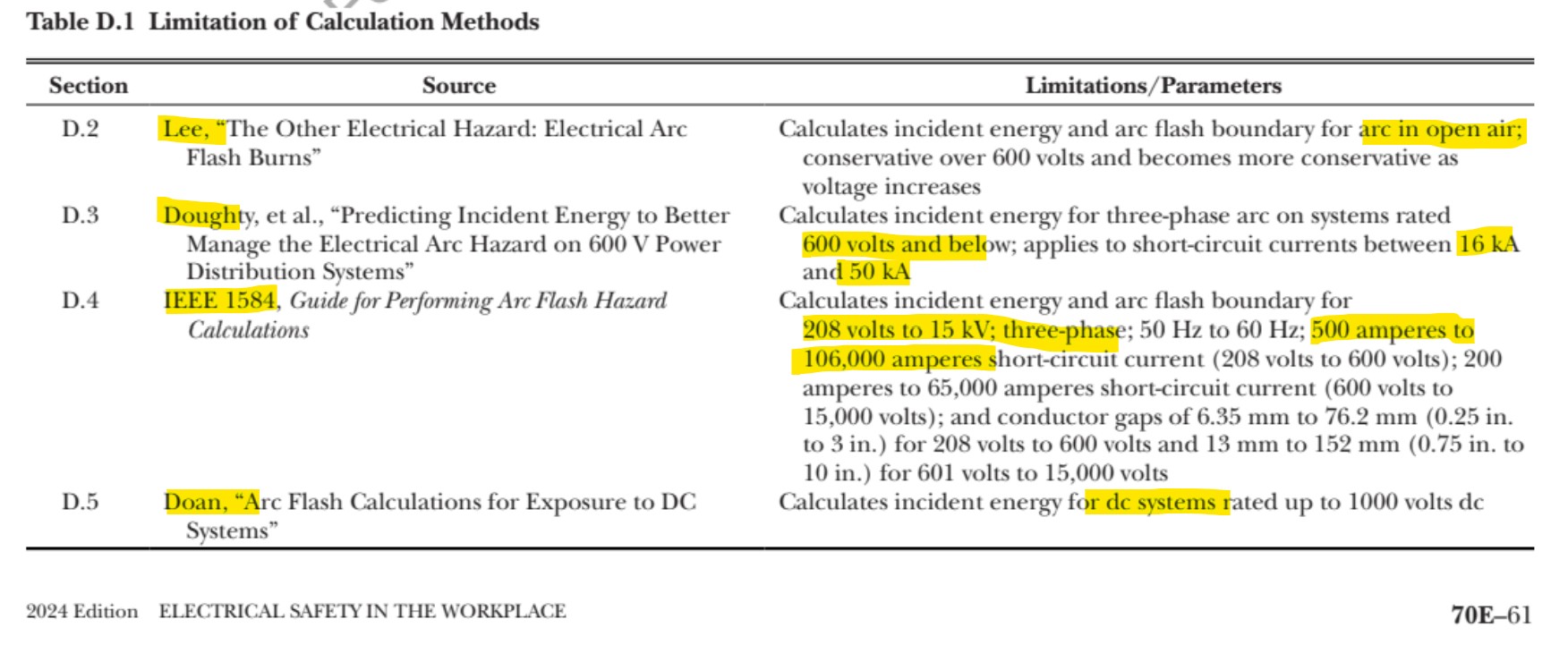 Not sure I am going to be able to help as I have not run a study with that high of available fault current. Is this part of a spot network with multiple parallel transformers? In any case, it looks like your bus voltage is 480V and the NESC and EPRI formulas are for over 15kV per the SKM setup screenshot you inserted so I don't think that is an option. Not sure why SKM would recommend those options. I don't think you can use 1584 or Doughty because your fault current is too high. According to NFPA 70E Table D.1, the Lee equations are for open air. However, I am not sure about that. There are some old threads on this forum about the Lee equation like this one: viewtopic.php?f=8&t=3590Here is the limitations table from 70E: Attachment: