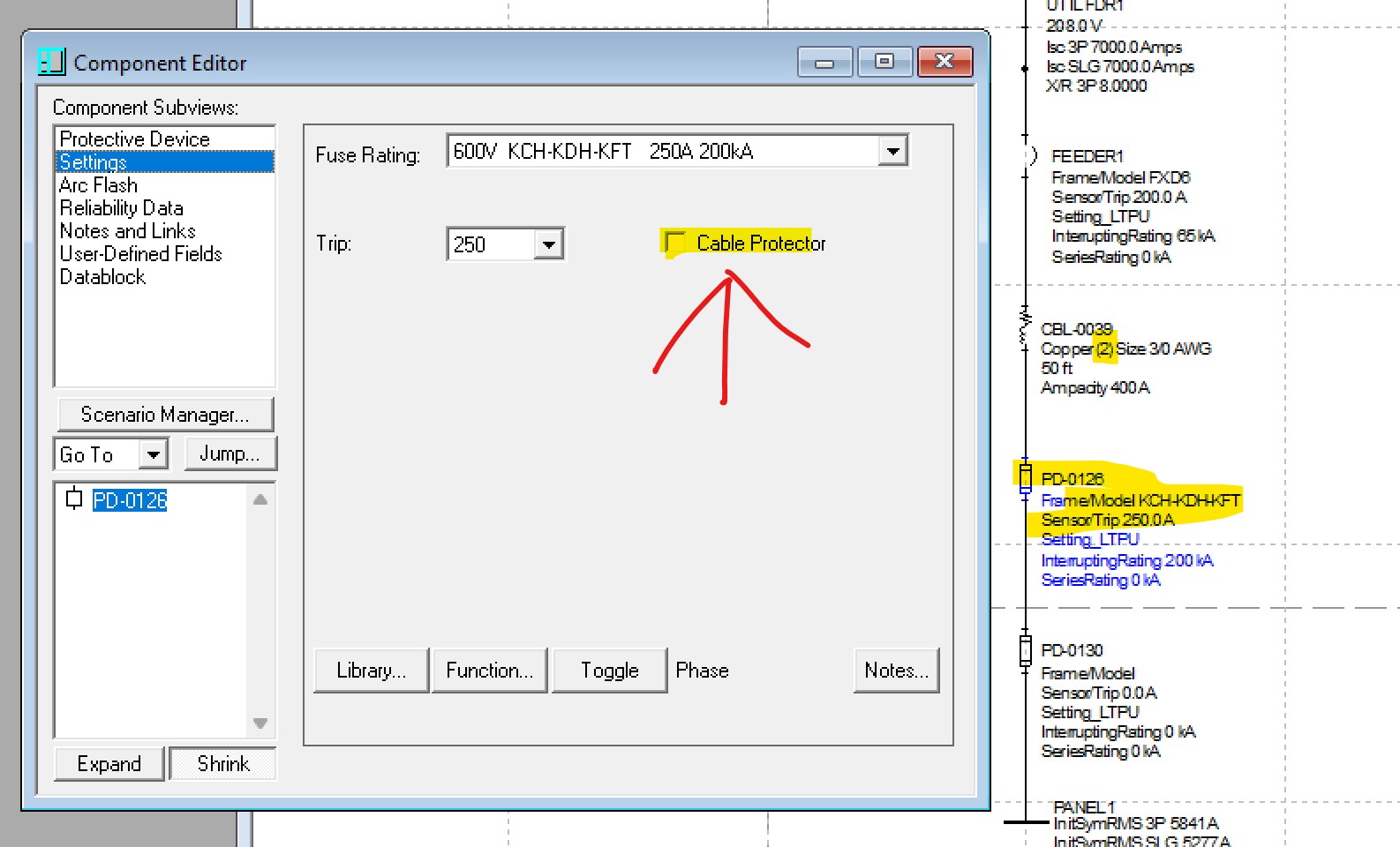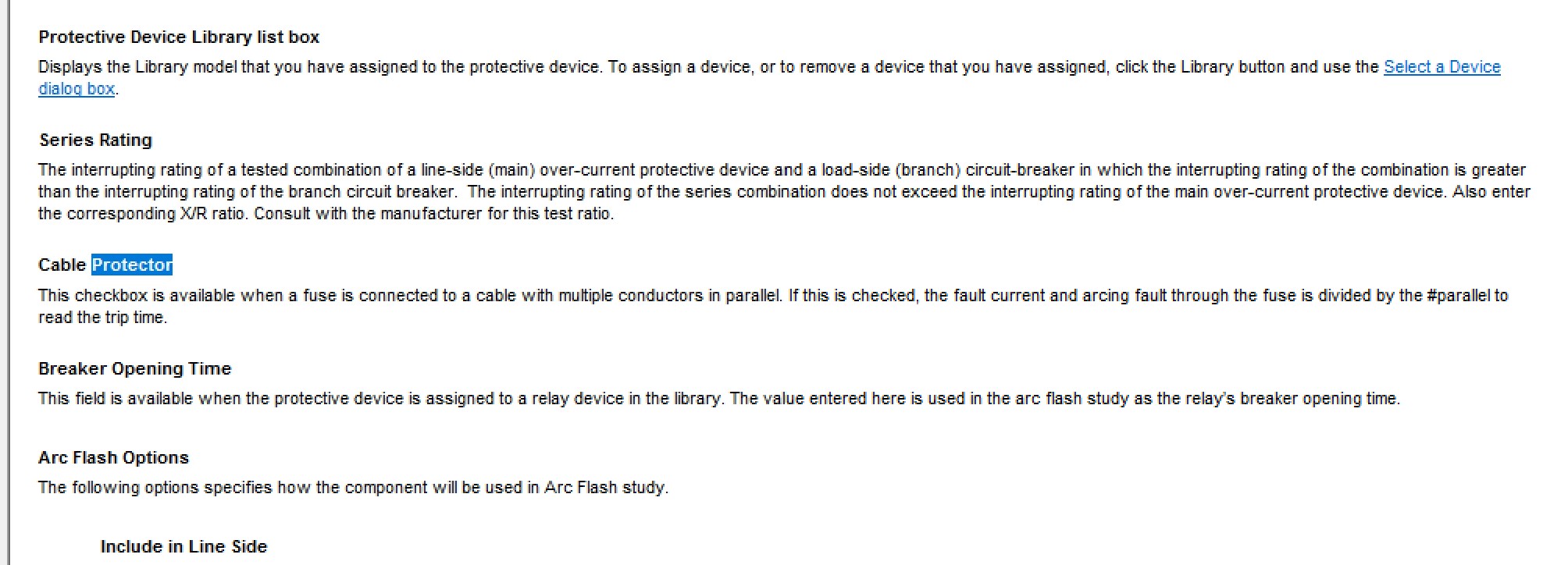 Found it. The cable protector check box appears when you have parallel sets of cable for a feeder. Checking the box will divide the fault current between the number of parallel sets, so the fault current "seen" by the cable protectors will be a half or a third, or a fourth or whatever the number of parallel sets you have and do the math for clearing based on that. Attachment: