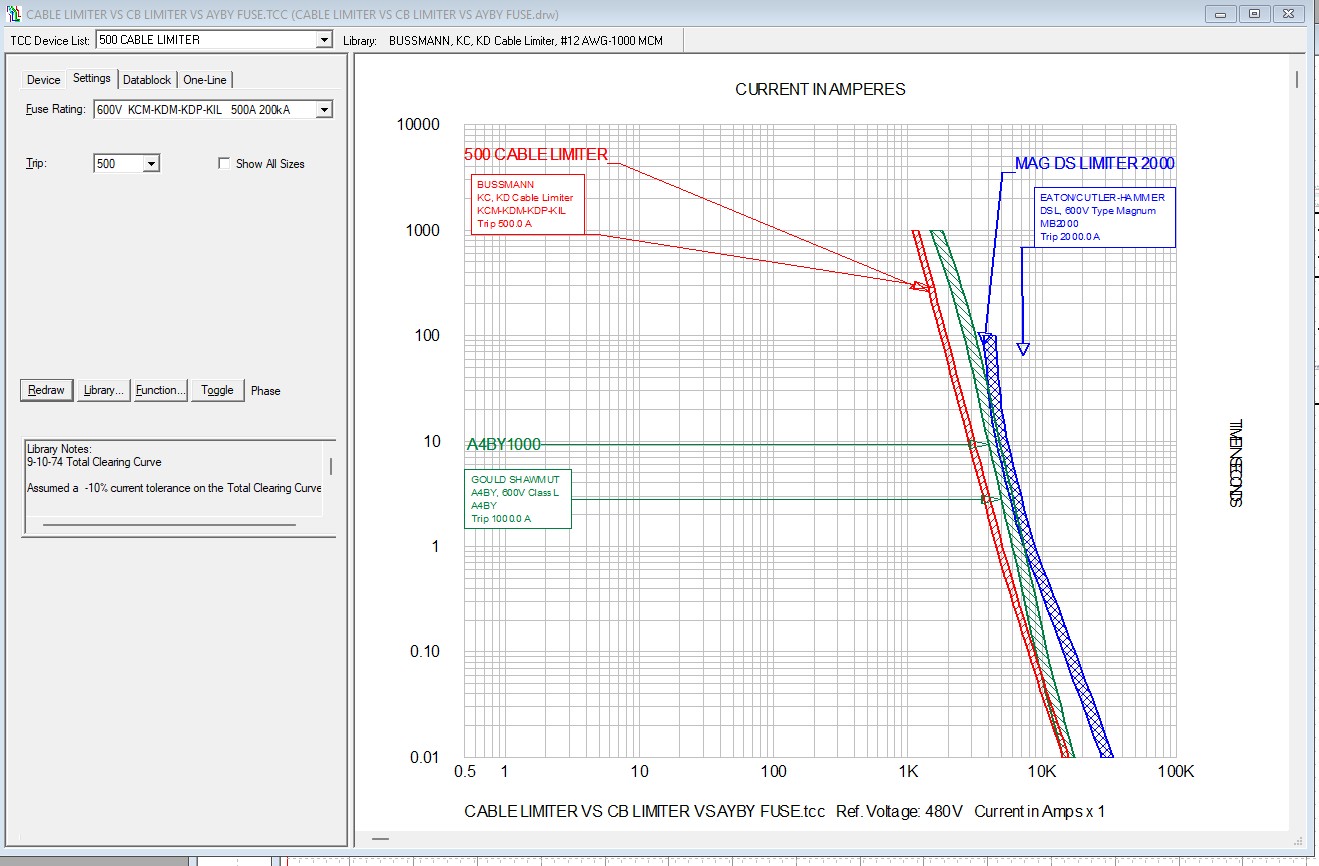 I just went back and looked at an old job where I had compared #500 cable limiters to a Eaton Magnum DS limiter installed in the gear in series with the breaker and a fuse. It looks like my memory failed me. If the #500 cable limiter had such a thing as a long time rating, it would be around 1000 amps, not 2000-2500a that I mentioned yesterday. Attachment: