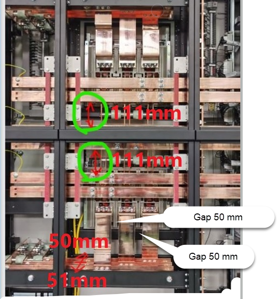 Please check the attached picture. In this situation i have a busbar along all SWB with a GAp of 111 mm between buses and also have electrodes with gap of 50mm in the connection to the protection unit, in this case the incomer from the source.