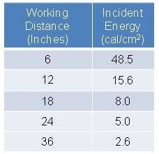 The table illustrates how incident energy varies with distance. Calculations were performed for distances ranging from 6 to 36 inches for a 480-volt panel. Depending on which distance is used, the incident energy varies from 2.6 calories per square centimeter (cal/cm2) to 48.5 cal/cm2. If the working distance was not included, a worker would not know that 2.6 cal/cm2 is based on being located a minimum of 36 inches away.