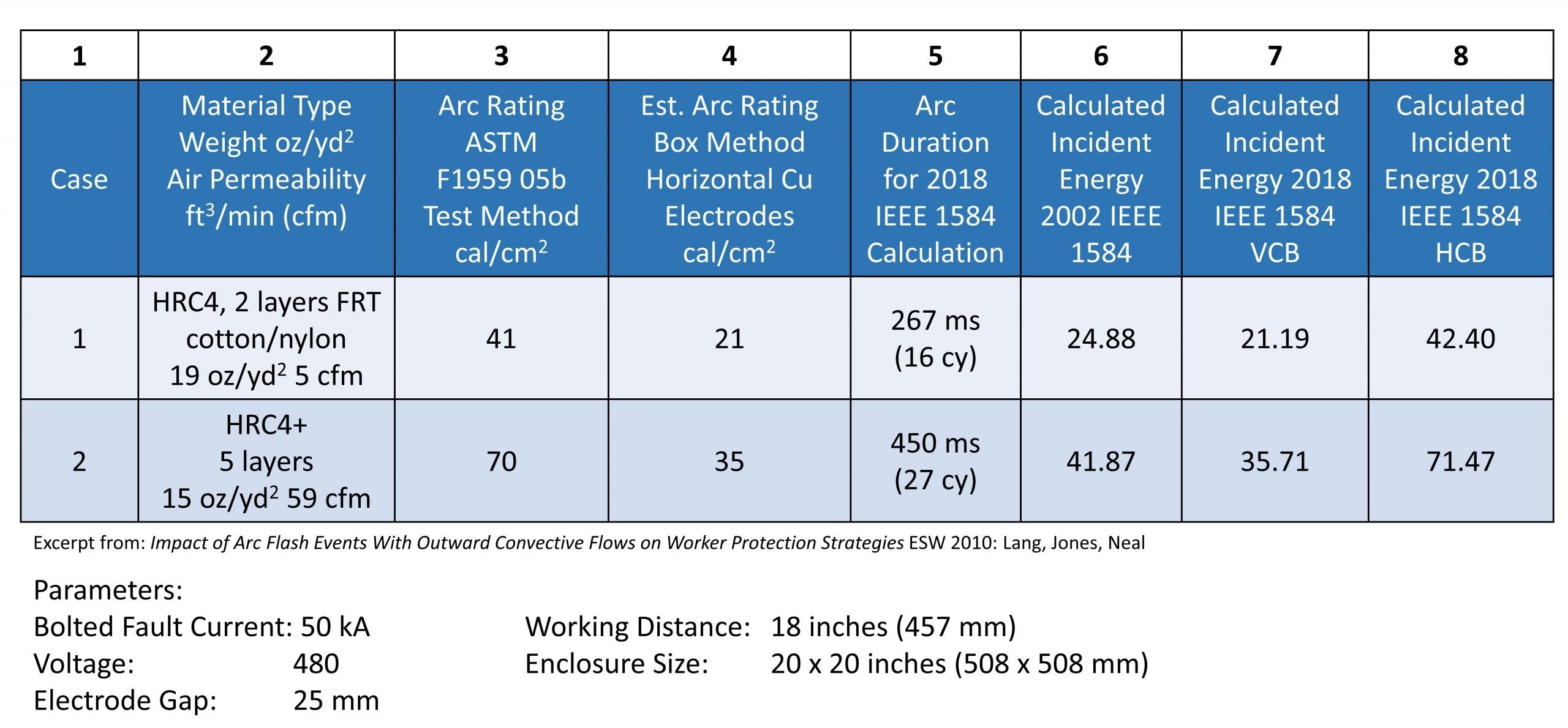 I tabulated their findings in the Table below. Cases 1 and 2 illustrate two PPE configurations from the paper and the corresponding arc ratings. Case 1 has a rating of 41 cal/cm2 and Case 2 has a rating of 70 cal/cm2 as shown in column 3. The conclusion was that if the material was placed in the convective flow using horizontal electrodes, it had an effective arc rating of 21 and 35 cal/cm2 respectively as shown in column 4.